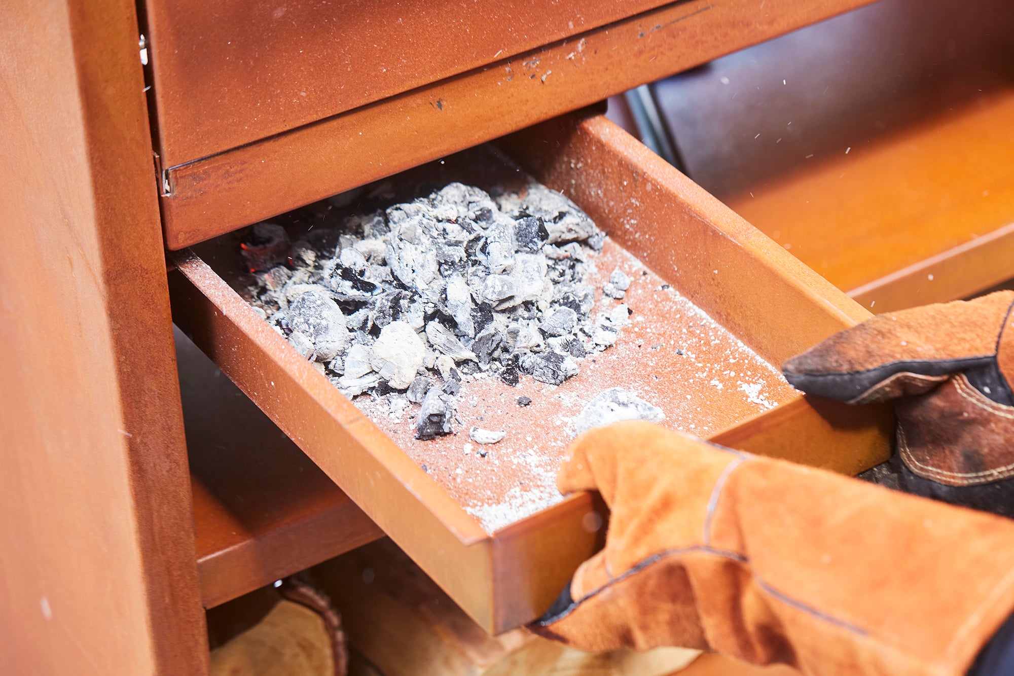 The drawer opens for easy access to wood and charcoal. Use the included poker to distribute coals evenly.