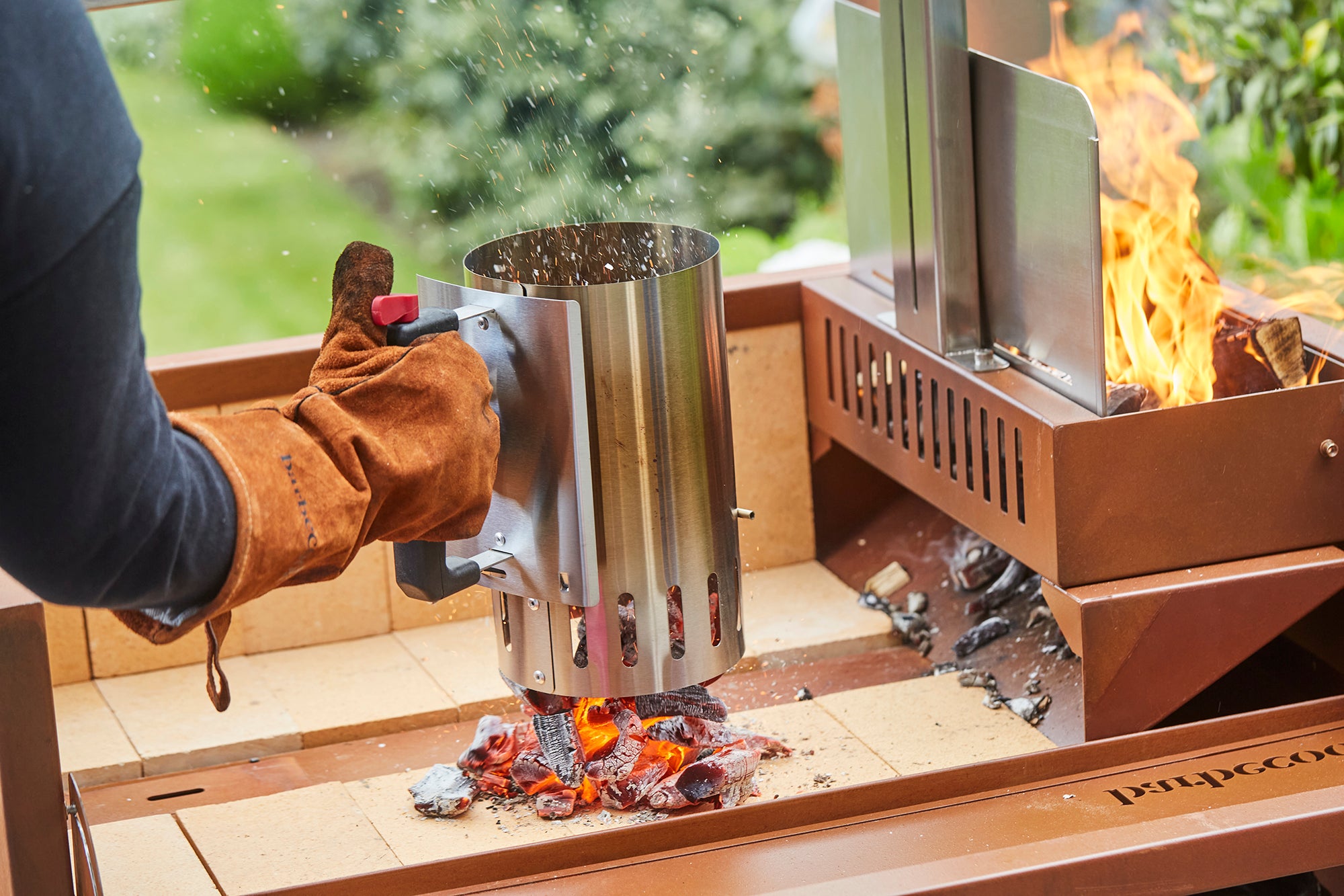 Option 2: using charcoal: Fill a charcoal starter and place it in the Pedro bowl. Add a few fire starters and ignite them. Wait until a thin white ash layer forms on the charcoal. Then it is ready for grilling.